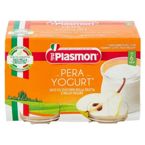 Pure Plasmon me dardhë, paketë 2 cope, për foshnjat mbi 6 muaj, ofron vitaminë C dhe fibra të shëndetshme.